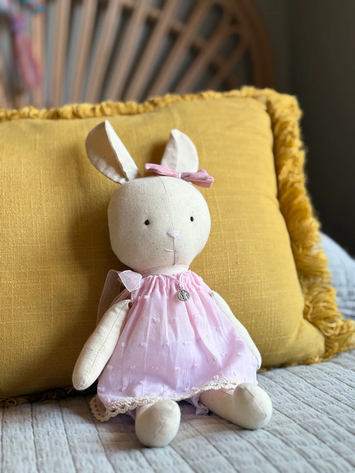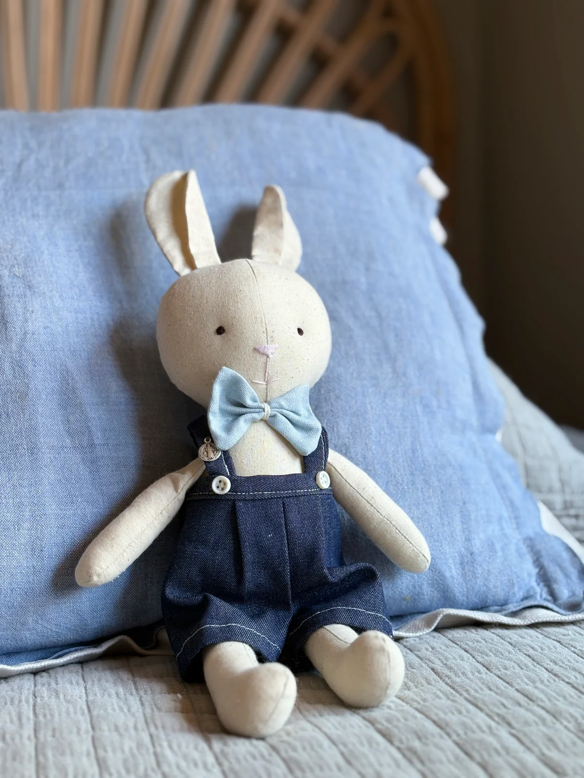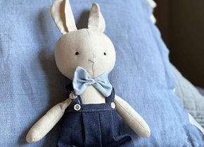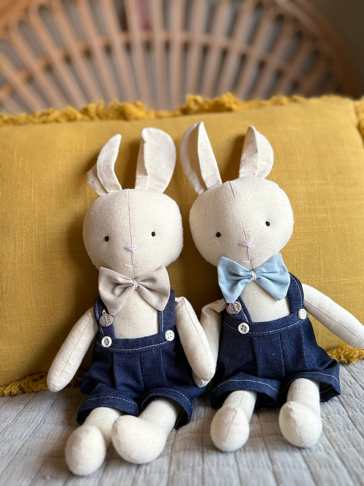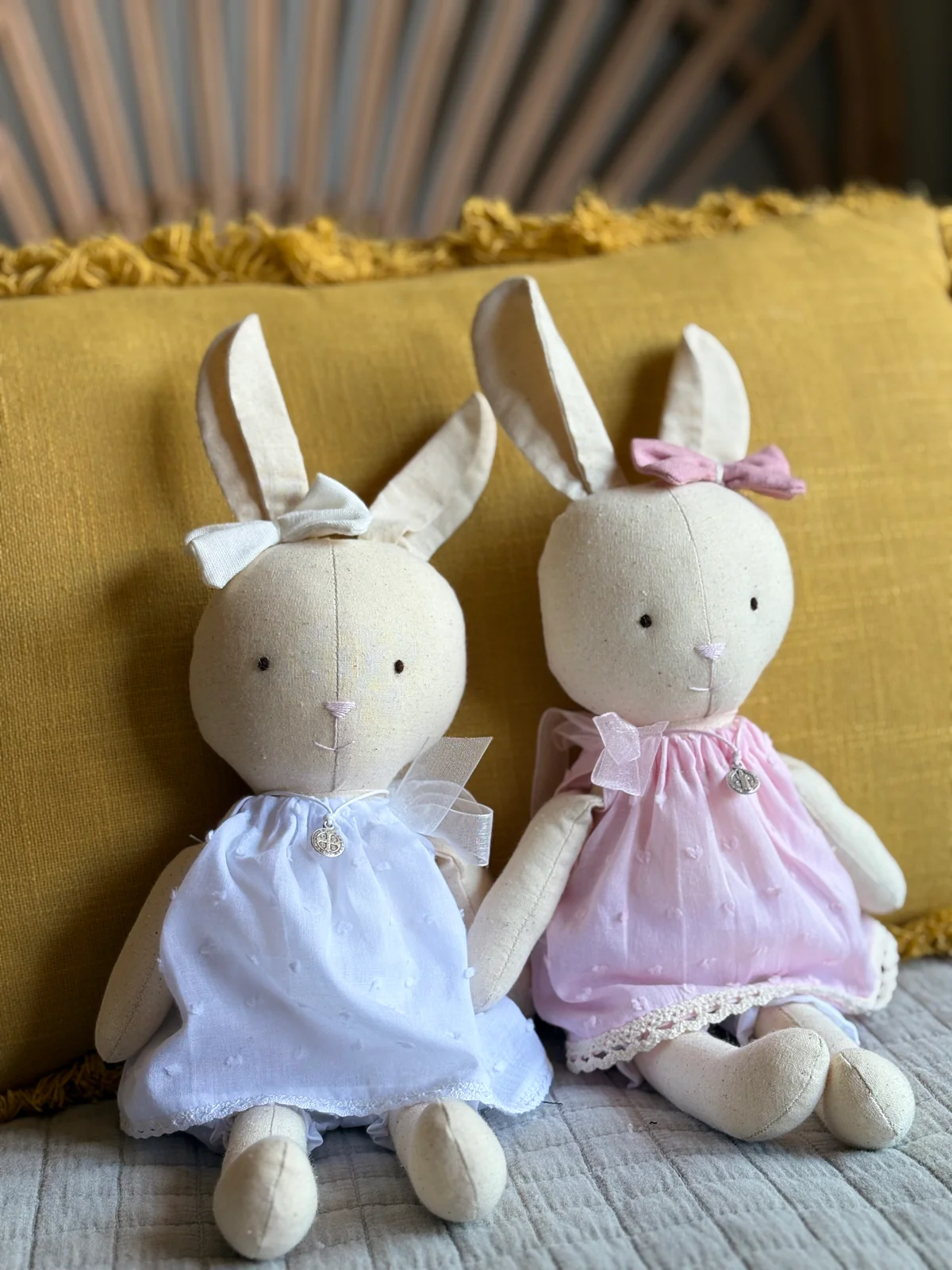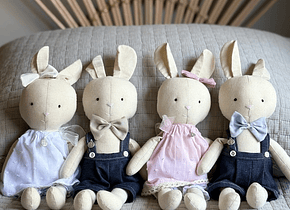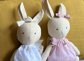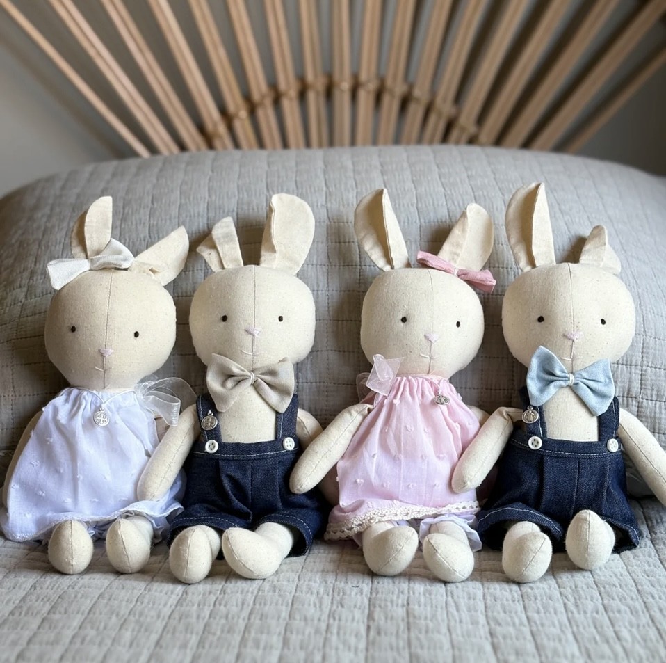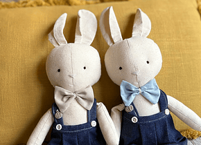 Descripción: Les presento a la Conejita Pascuala y el Conejito Pascual, hechos a mano y con amor, en tela suave y rellena de algodón. Este dúo de tiernos conejitos son un regalo perfecto para bautizos o nacimientos. Pascuala viene con un delicado vestido rosa o celeste y un medallón protector. Pascual viene con un canchero pantalón jardinero en tela de jean con moño y dije protector.