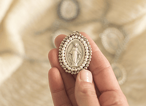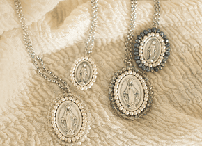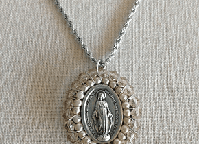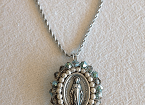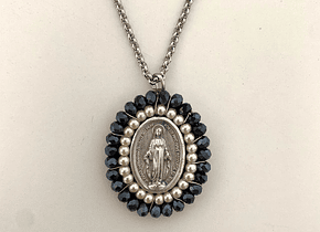 Material: Medalla de peltre cosida con perlitas y vidrios checos y cadena de acero quirúrgico.