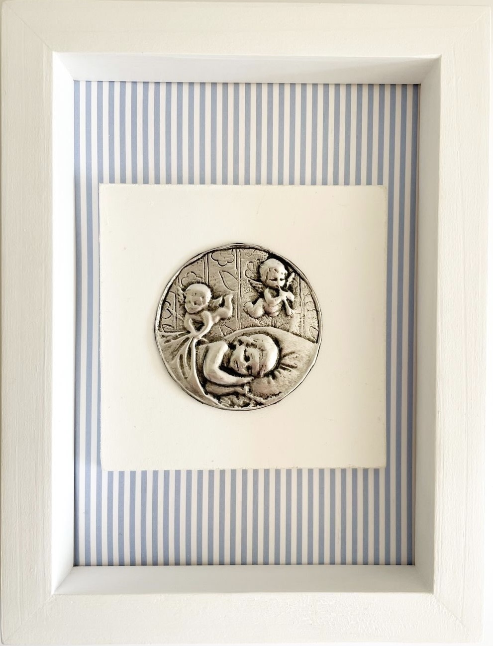 Color: Marco blanco y fondo de rayas delgadas celestes y blancas.