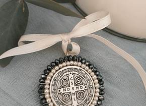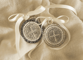 Material: La medalla es de Aluminio y está cosida con perlas de río y Vidrios checos. Regalo ideal para Nacimientos o Bautizos. Se los coloca en cunas, moisés o cochecitos y su significado es protección: