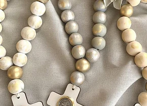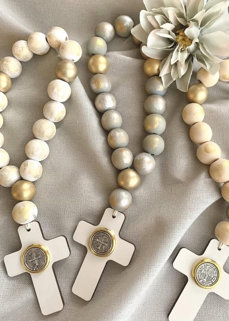 Material: Denario hecho a mano en tonos dorado, aperlado y gris. Con cruz blanca con medalla de San Benito para tu protección.