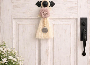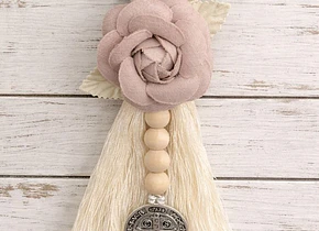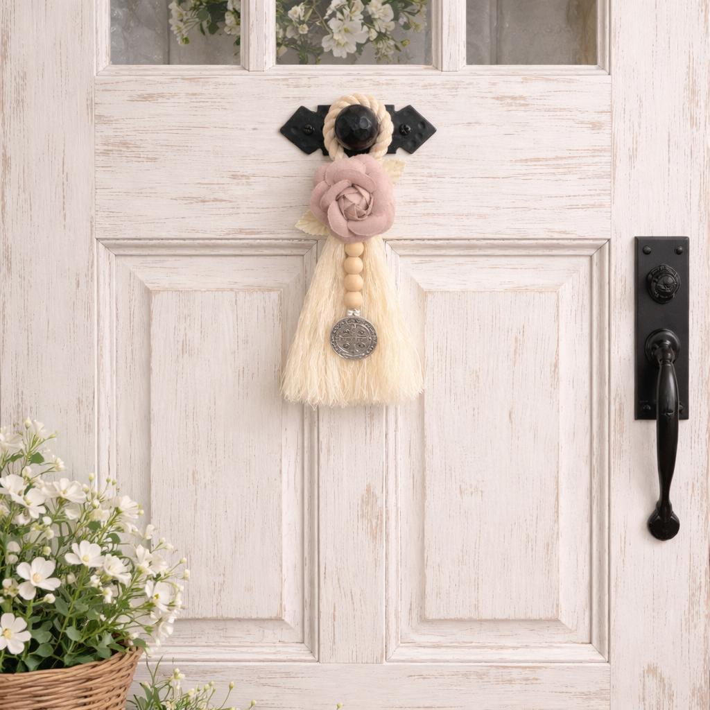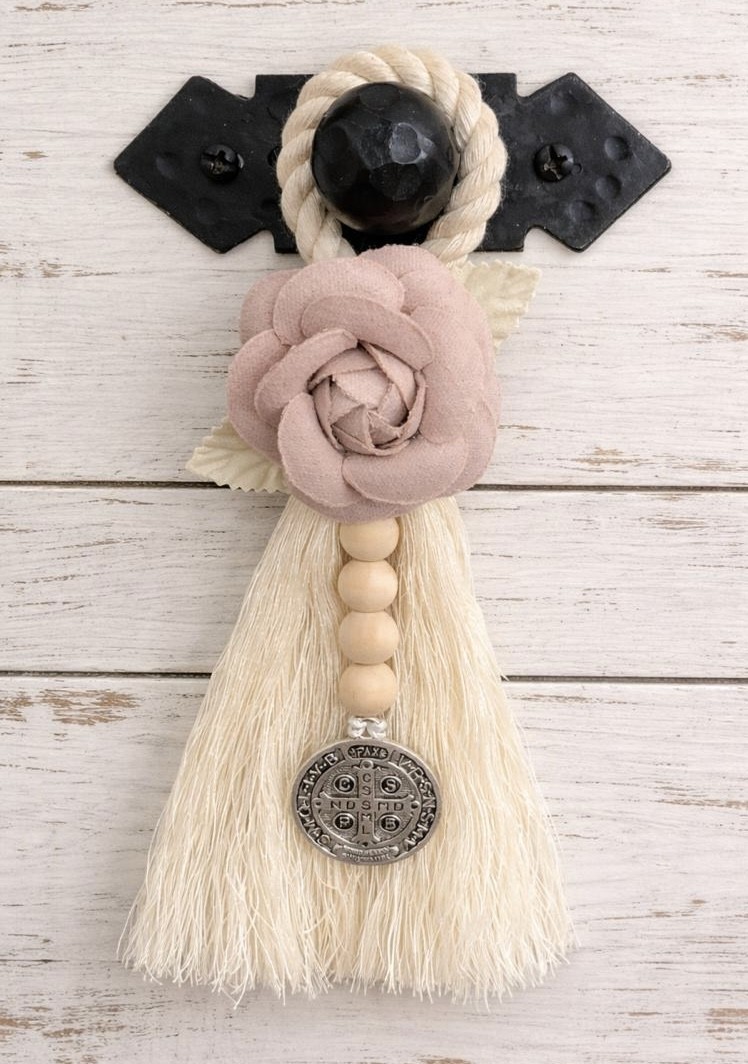 Detente artesanal con medalla San Benito, flor de tela y cuentas de madera natural. Un detalle que protege y enamora. No solo es un adorno. Es un abrazo que le das a tu casa, cada día.