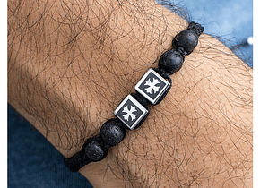 Material: Pulsera de hilo con terminación macramé, piedras volcánicas y 2 piezas cuadradas de acero con una cruz. La cruz que tiene se llama Cruz Flordelisada o Cruz Fleury. Una cruz fleury es una cruz adornada en los extremos con flores en heráldica. Generalmente contiene la flor de lis, tréboles, etc.