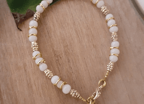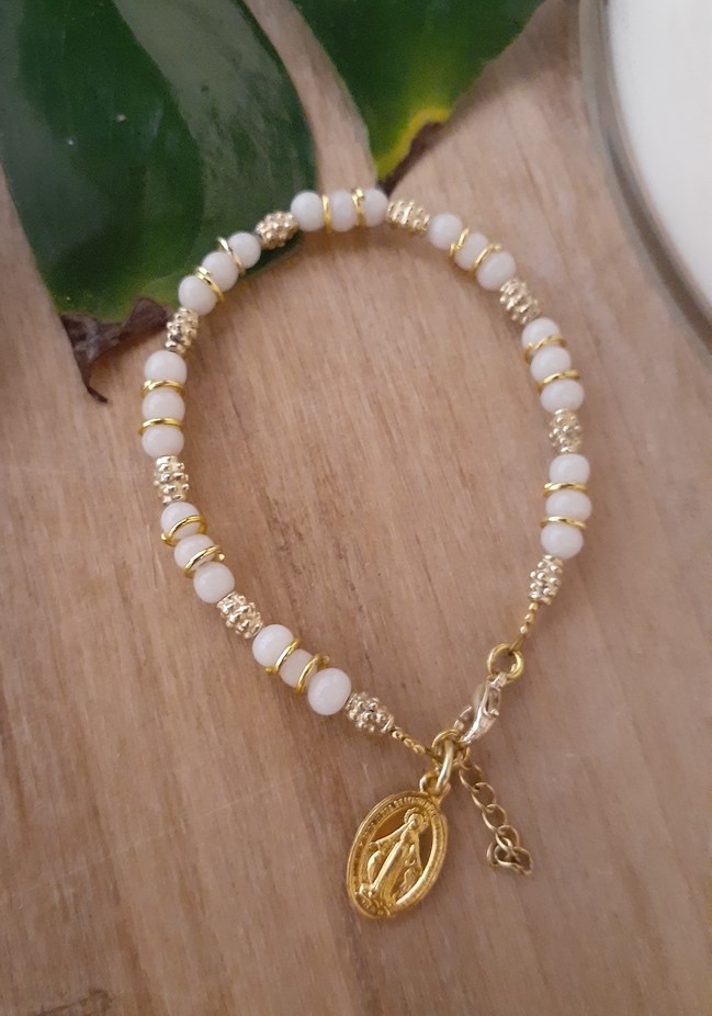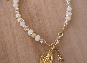 Material: Vidrios en crudo y separadores bañados en dorado. Viene con una medallita Milagrosa dorada de aluminio.