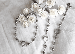 Material: Pulsera denario con cuentas y medalla virgen niña de acero quirúrgico. Un regalo ideal para comuniones o confirmaciones.