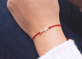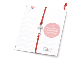 Material: Pulsera de hilo en color rojo con dije de metal con cruz apaisada.