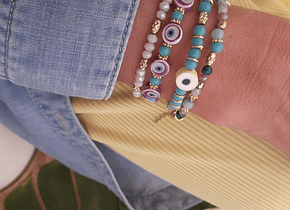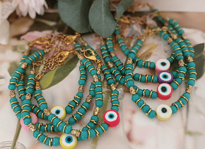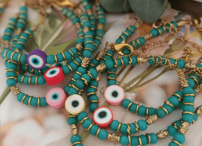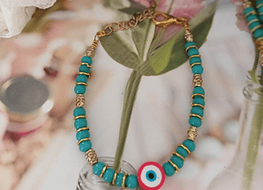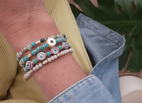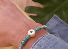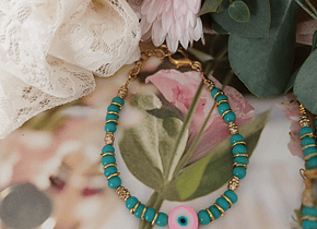 Material: Vidrios turquesa y argollas doradas. El ojo de goma viene en 4 colores a elegir.