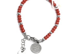 Material: Pulsera de cuentas de acero muy pequeñas y cuentas de cristal facetado con medalla de San Benito en acero. Mosquetón de acero quirúrgico.