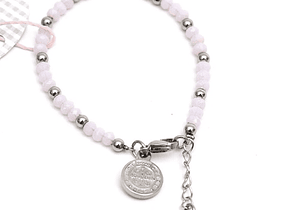 Material: Pulsera de cuentas de acero muy pequeñas y cuentas de cristal facetado con medalla de San Benito en acero. Mosquetón de acero quirúrgico.