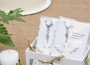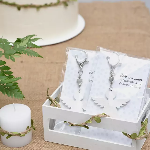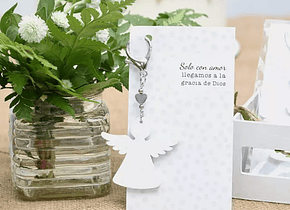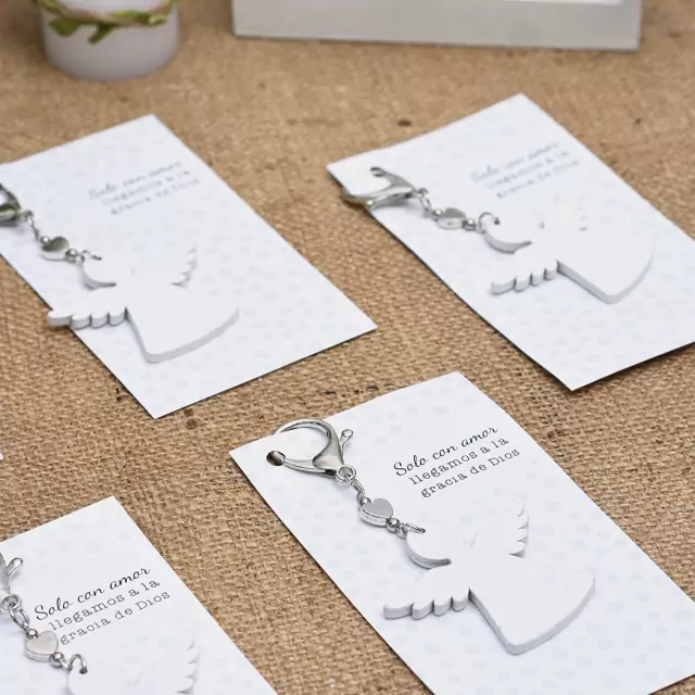 Material: Souvenir de tipo bendici贸n. Incluye tarjeta con frase: "Solo con amor llegamos a la gracia de Dios". Viene listo para entregar en tu evento. Ideal para comuni贸n, bautismos y nacimientos. El angelito es de madera blanca y tiene un dije de coraz贸n. 馃挕隆Podes usar la tarjeta con oraci贸n como se帽alador de hojas!