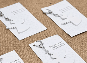 Medida: Medida de la tarjeta: 8x14 cm. Medida del souvenir extendido desde el comienzo del hilo hasta el final de angelito: 12 cm. aproximadamente.